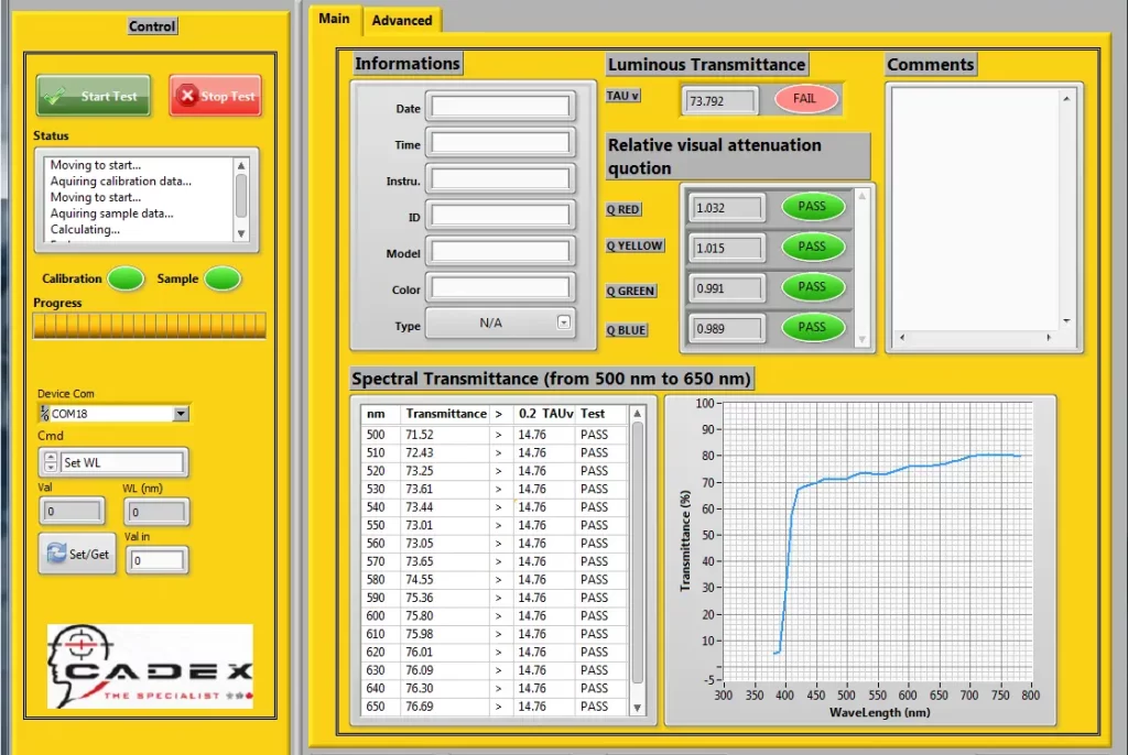 The spectrophotometer is designed and manufactured to test the recognition of signal light, spectral transmittance and luminous transmittance of ocular visors and protective lenses according to ECE 22 standards.